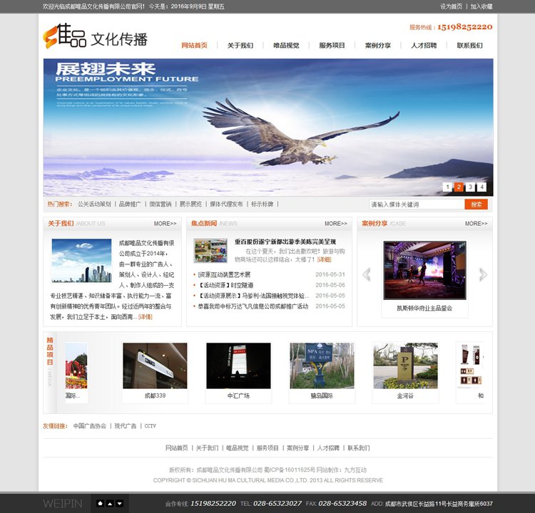 成都唯品文化传播有很公司成立于2014年,由一群专业的广告人、策划人、设计人、经纪人、制作人组成的一支专业技艺精湛、知识储备丰富、执行能力一流、富有创新精神的优秀青年团队。经过近两年的整合与发展,我们立足于本土,面向西南,放眼全国,致力于全方位为企业提供品牌策略、品牌形象塑造、品牌形象设计及公关活动、营销行销服务。专注于高水准的传播策略、创意及工艺实施于商业品牌传播领域,探索并实现营销在各行业的应用,以高水准的执行呈现客户的精彩独到之处,提升品牌价值,建立优秀的企业品牌形象。
