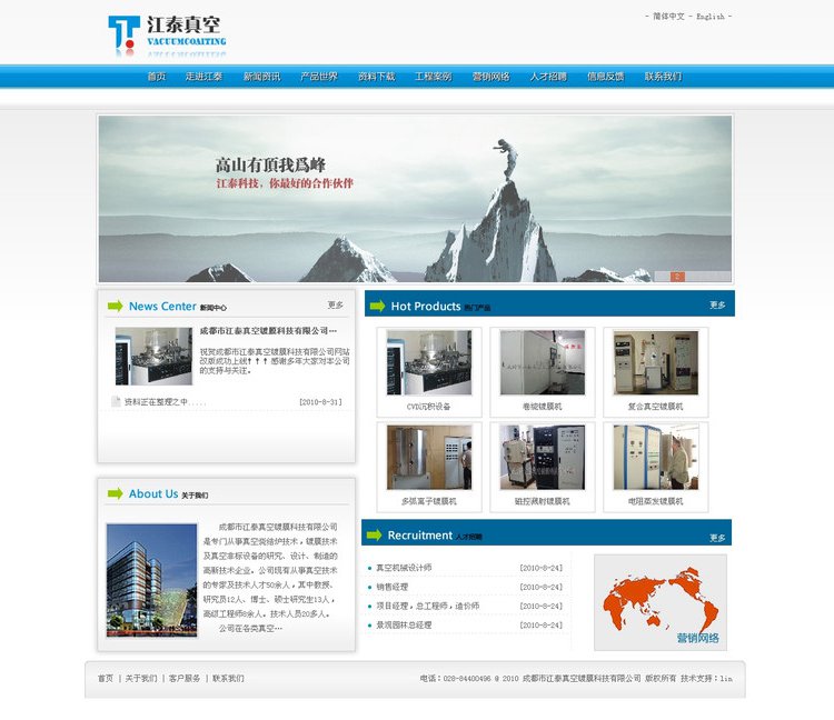 成都市江泰真空镀膜科技有限公司是专门从事真空烧结炉技术,镀膜技术及真空非标设备的研究、设计、制造的高新技术企业。公司现有从事真空技术的专家及技术人才50余人,其中教授、研究员12人、博士、硕士研究生13人,高级工程师8余人。技术人员20多人。